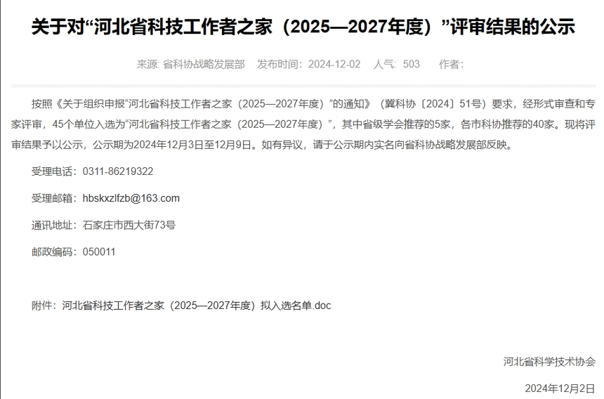 “河北省科技工作者之家”評審結果公示